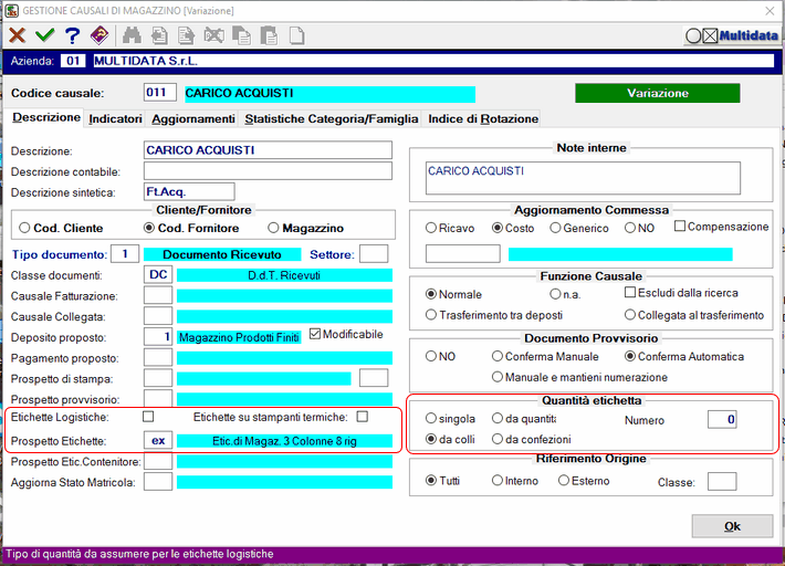 La causale di magazzino deve avere predisposto il “Prospetto Etichette”.