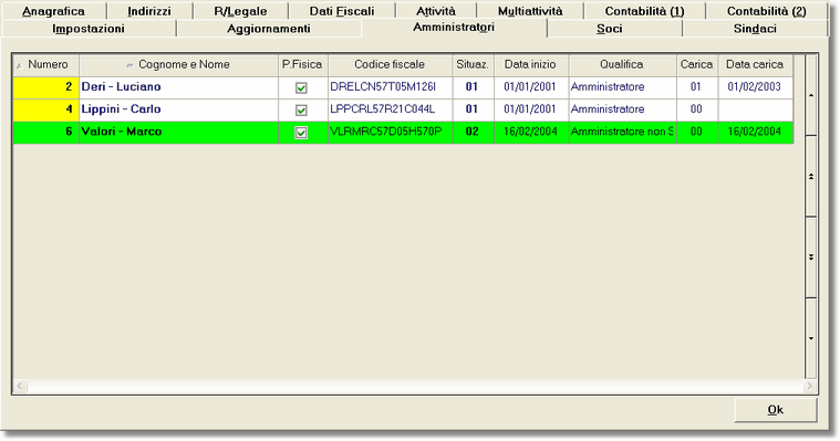 La scheda Amministratori permette di inserire tutti i nominativi degli amministratori dell'azienda selezionata, costruendo così una scheda storica di tutti i soggetti che sono stati, almeno per un periodo, componenti del consiglio di amministrazione.