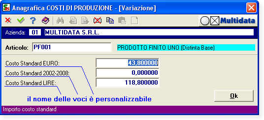 I costi di produzione sono a messi a totale disposizione dell'utente, e possono essere utilizzati come riferimento per i calcoli nelle elaborazioni dei programmi di produzione. I nomi relativi alle tre voci sono personalizzabili tramite la gestione dei campi liberi con il numero record 502.