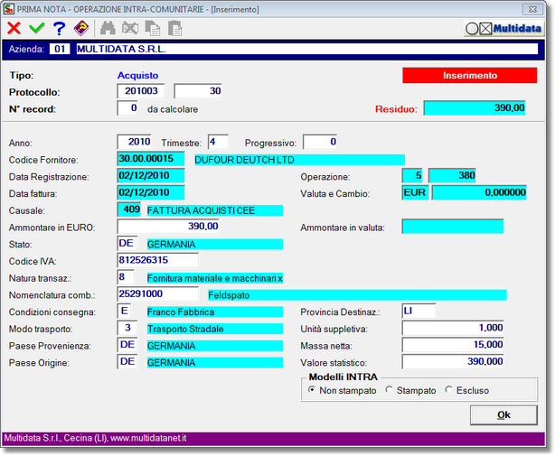 Progressivo: numero progressivo dell'operazione all'interno della stampa della dichiarazione intra-stat. Si tratta di un campo poco significativo, che viene valorizzato in sede di stampa dei modelli Intrastat, e di solito dovrebbe essere lasciato a zero.