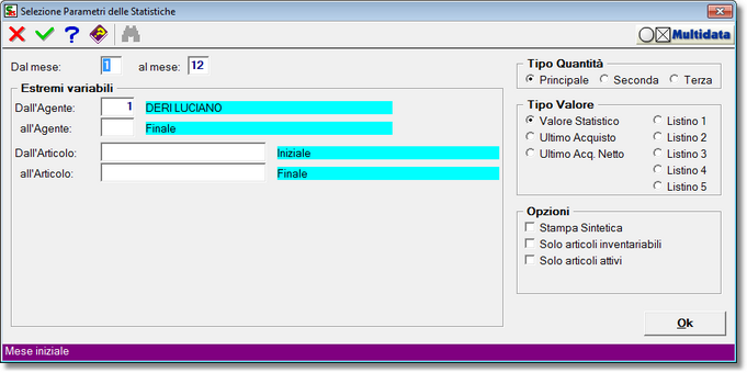 Per prima cosa è opportuno selezionare la statistica che si desidera visualizzare. A parte le opzioni di visualizzazione sintetica (che riporta un solo rigo nella tabella per l'intero periodo, senza suddivisione tra i mesi) e quella per la ripetizione dei valori (togliendo la barratura alla casella i valori delle categorie vengono ripetuti soltanto per il primo rigo, in modo da facilitare la lettura), è possibile accedere al pannello delle impostazioni attraverso il tasto funzione