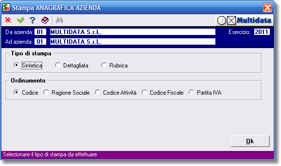 Stampa alcune informazioni anagrafiche delle aziende selezionate. Si possono selezionare le aziende in base al tipo di contabilità e alla periodicità IVA. L'ordinamento prodotto può essere per codice azienda o per ragione sociale.