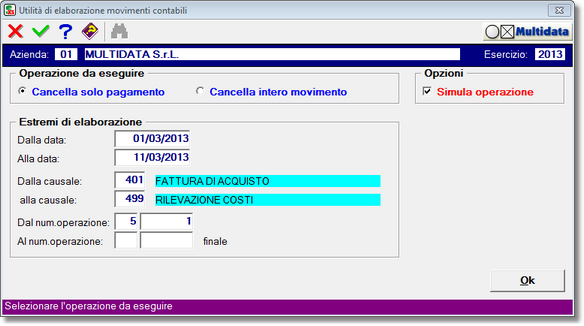 Selezionando la casella barrata Simula operazione, il programma non eseguirà alcuna operazione sugli archivi storici della procedura, ma produrrà soltanto la stampa riepilogativa dei movimenti considerati. Tale opzione è utile per eseguire un primo controllo prima di eseguire l'elaborazione vera e propria.